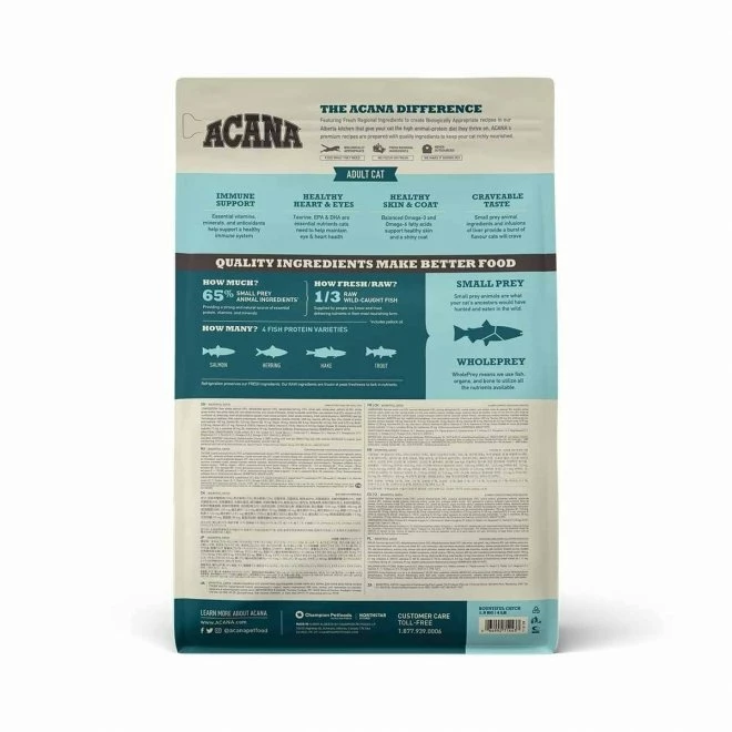 Acana Cat Adult Bountiful Catch inneholder masse deilig fisk av høy kvalitet: laks, lysing, sild og regnbueørret. Fôret følger WholePrey-dietten, som betyr at man bruker hele byttedyret – fisken, i dette tilfellet. Det gjøres for å etterligne måten katten hadde spist i det fri, der den hadde fanget fisken og spist opp alle delene.