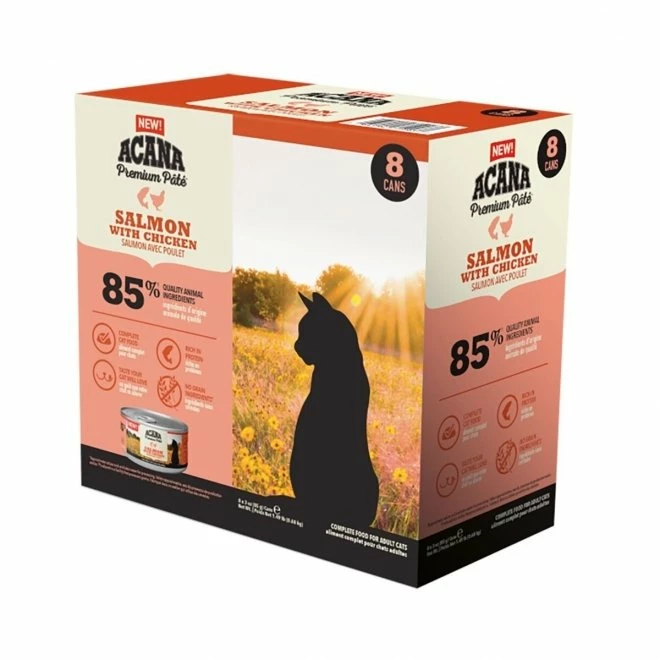 Acana Cat Adult Premium Paté Salmon & Chicken et et førsteklasses våtfôr spesialutviklet for voksne katter. Fôret inneholder ingredienser av høy kvalitet, som laks og kylling.