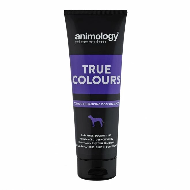 Ser pelsen til hunden din sliten og matt ut? Animology True Colours milde hundesjampo hjelper til med å forsterke fargen og glansen i hundens pels. Denne sjampoen passer for alle slags hunder uansett pelsfarge. Sjampoen er mildt parfymert og har en balansert pH-verdi samt fullproppet med vitaminer og beroligende ingredienser. Sjampoen inneholder også en innebygd balsam som gjør hundens pels herlig myk etter hvert eneste bad.
