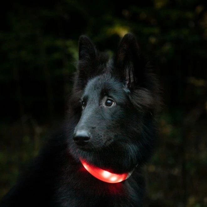 Et lysende hundehalsbånd er et perfekt tilbehør til vanlige reflekser, slik at du og hunden synes i mørket.