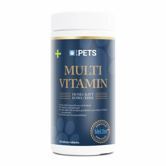 Better Pets Multivitamin inneholder alle vitaminer og mineraler hunden trenger for å leve et sunt og aktivt liv. Multivitamin er tabletter med kjøttsmak, og fungerer som et sunt kosttilskudd i hundens kosthold.