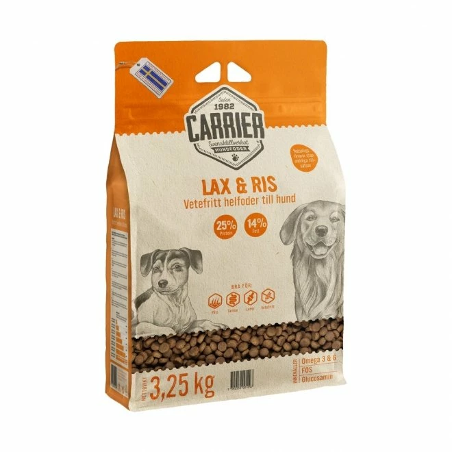 Carrier Laks & Ris er et svenskprodusert komplett fôr som passer for unge og voksne hunder. Det har laks som eneste animalske proteinkilde og det er helt fritt for hvete, kunstige konserveringsmidler og fargestoffer. Fôret inneholder alle de vitaminene og næringsstoffene som hunden din trenger – og det passer ekstra godt til hunder som: