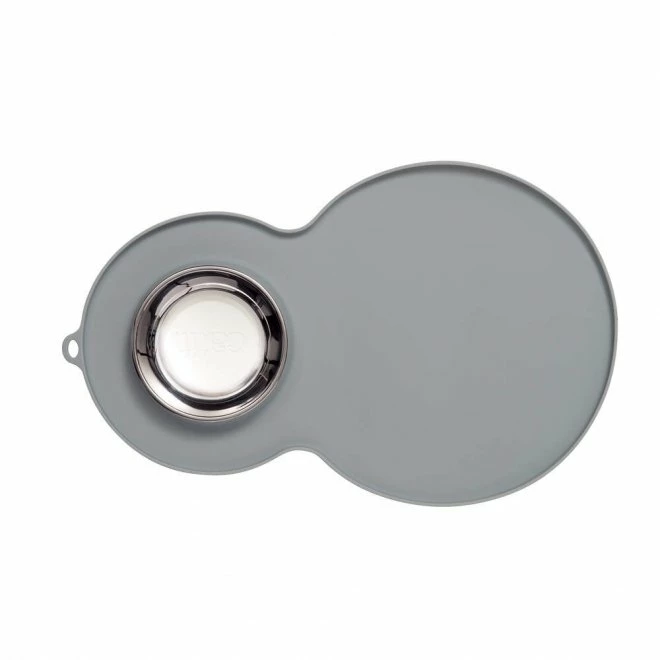 Myk, beskyttende silikonmatte og en skål i rustfritt stål. Holder vannfontener og andre skåler på plass, og beskytter gulvet mot vann- og matsøl. Matten er enkel å rengjøre og størrelse cirka 45 x 29 cm.