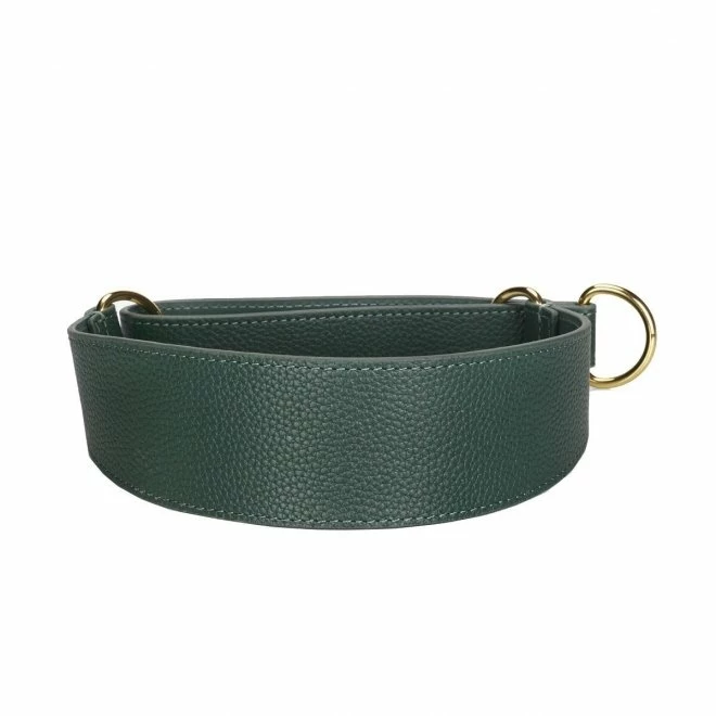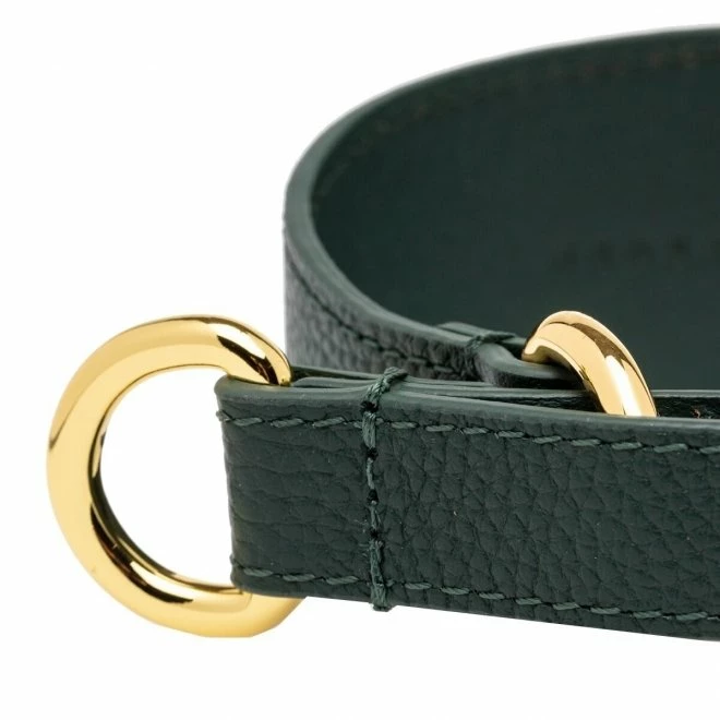 Collar of Sweden Bredt Hundehalsbånd Mørkegrønn er laget i bærekraftig vegansk skinn og har en herlig mørkegrønn farge med fine gulldetaljer på spennen og D-ringen der kobbelet festes.