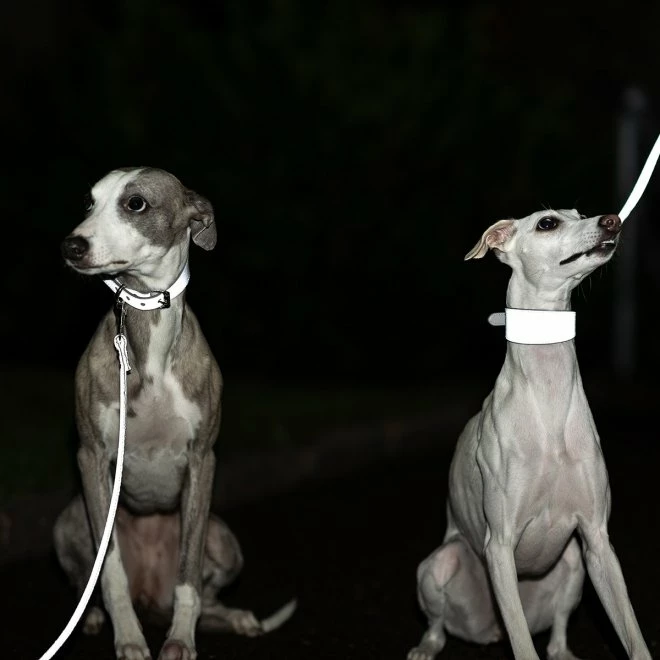 Hele halsbåndet er laget av et refleksmateriale som gjør at du og hunden din vises ekstra godt i mørket – Praktisk! Halsbåndet er justerbart og har fine sølvdetaljer på spennen og D-ringen hvor kobbelet festes.