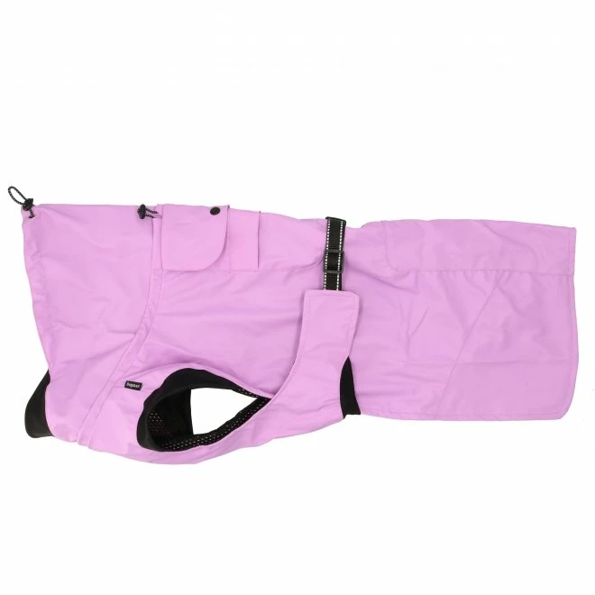 Regndekkenet er enkelt å tilpasse til hundens kropp takket være to snører i nakken og en justerbar stropp rundt brystkassen.