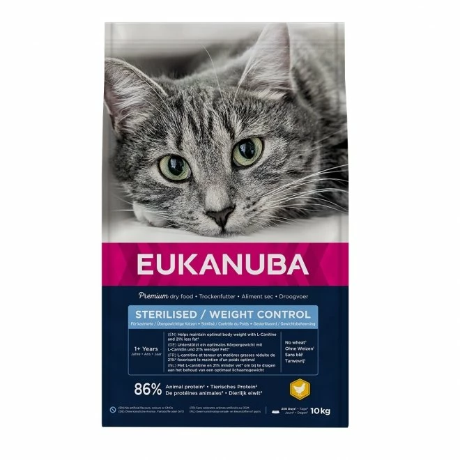 Eukanuba Cat Adult Sterilised & Weight Control Chicken har et lavt fettinnhold som passer til katter som har en tendens til å legge på seg for mye. Fôret har 21 % lavere fettinnhold enn Eukanubas vanlige fôr til voksne katter.