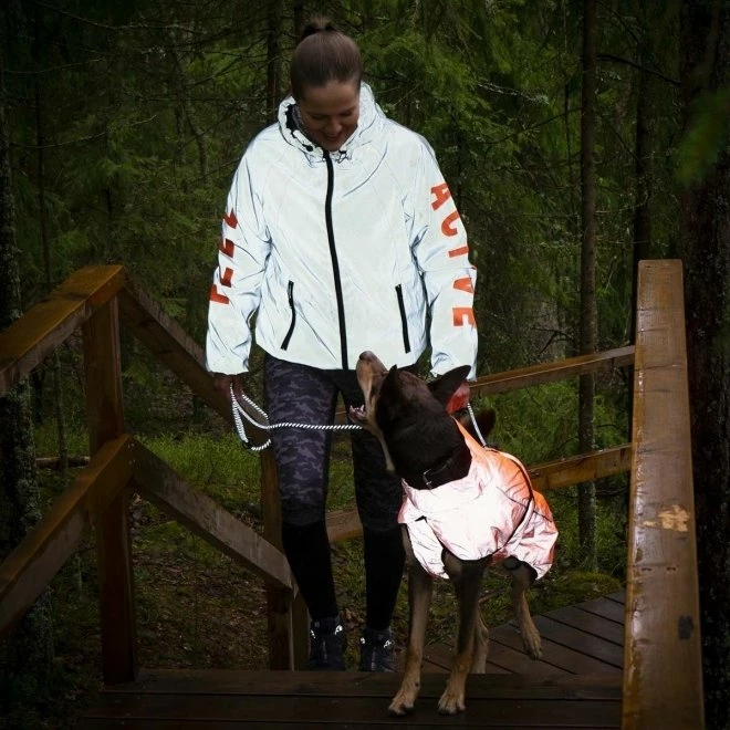 Match hunden med en lekker og vanntett refleks-regnjakke fra samme serie. Du finner den mørkegråe Feel Active-jakken her