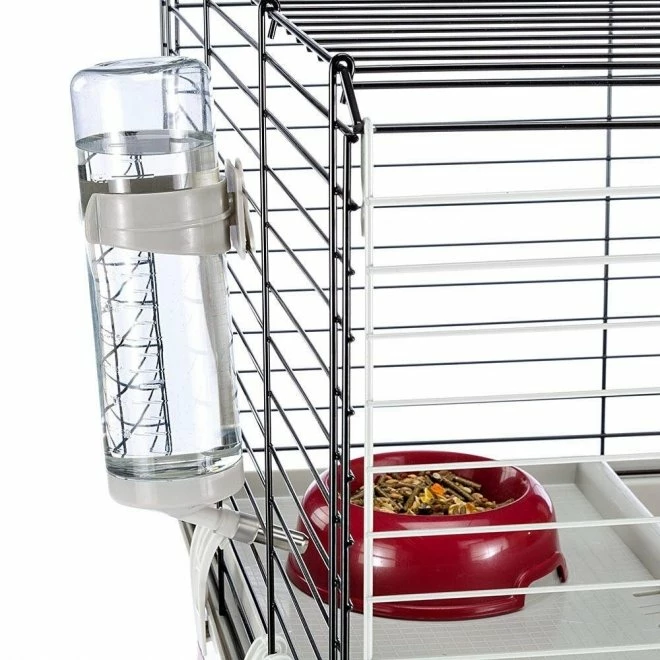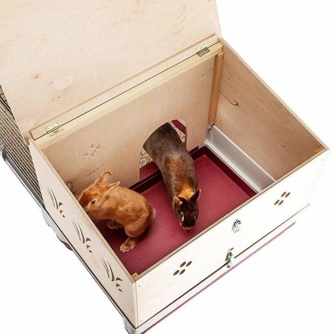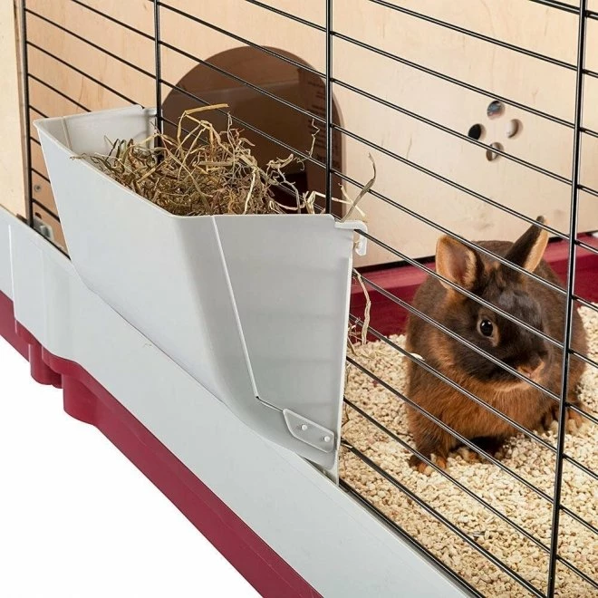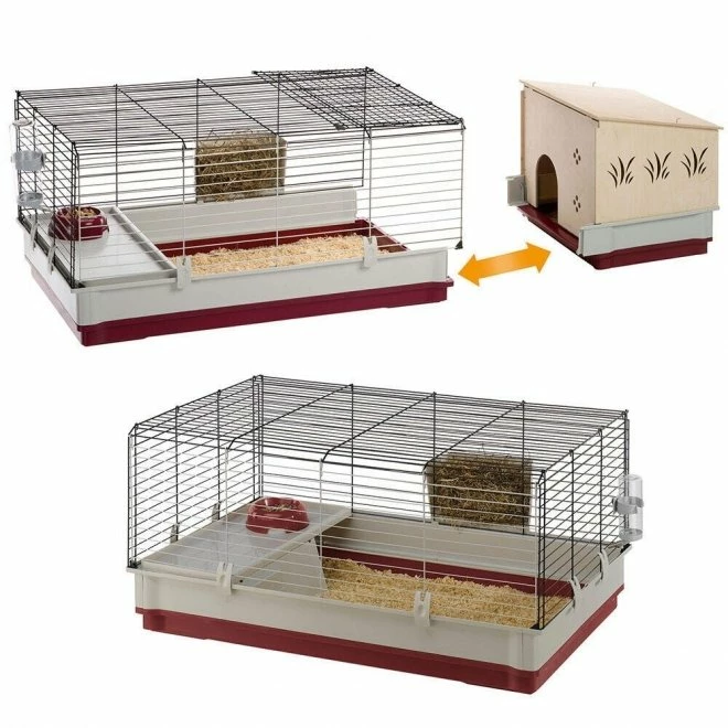 Buret er romslig og koselig, men blir ekstra fint hvis man fester det fine kaninhuset av tre med malte detaljer på sidene. Husets tak kan åpnes, noe som er ekstra praktisk når du vil løfte ut kaninen din. Det finnes selvfølgelig en dør i den delen av buret som består av gitter. Ferplast Krolik 140 plus er stort nok til å romme 2 mindre kaniner på opptil 2 kg. Burene passer også til marsvin!