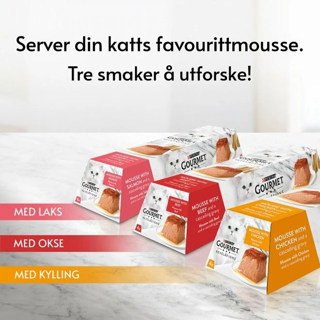 Gourmet Revelations med kylling har myk og glatt konsistens som gjør det lett for katten å spise og nyte maten sin. Den praktiske emballasjen gjør det også enkelt å servere maten til katten.