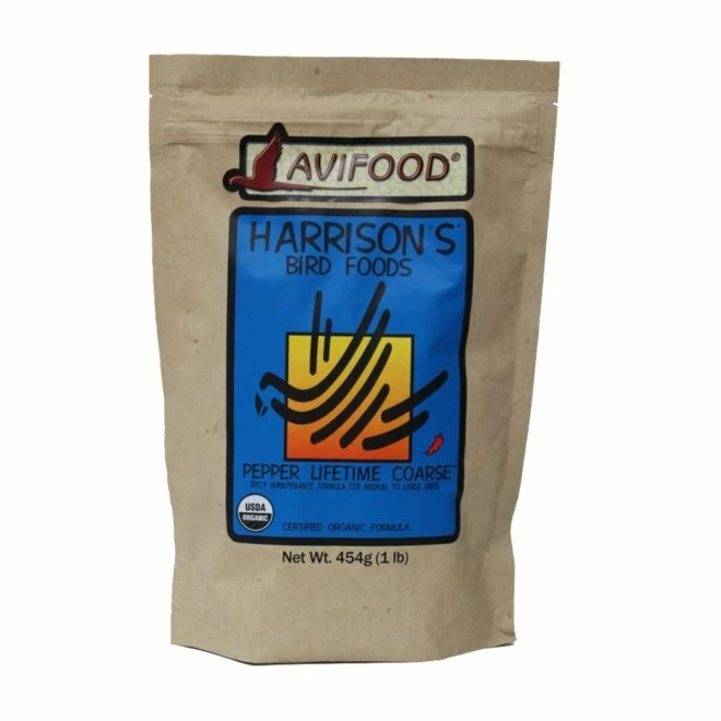 Harrison’s Pepper Lifetime Coarse er et forum la egnet for fugler med et normalt ernæringsmessig krav. Smaken er krydret som ofte øker appetitten til fuglen og gjør også fôret egnet til å bruke som gtides i stedet for søtsaker. Pepper Lifetime anbefaler også til fugler som har papillomatose.
