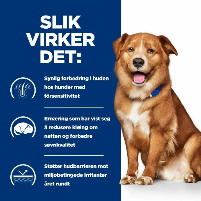 Dette veterinærfôret er spesielt utviklet for å passe hunder som har problemer med matintoleranse og/eller problemer med hud og pels. Den passer for hunder som lider av atopisk dermatitt og for hunder som har store problemer med pelsfelling.