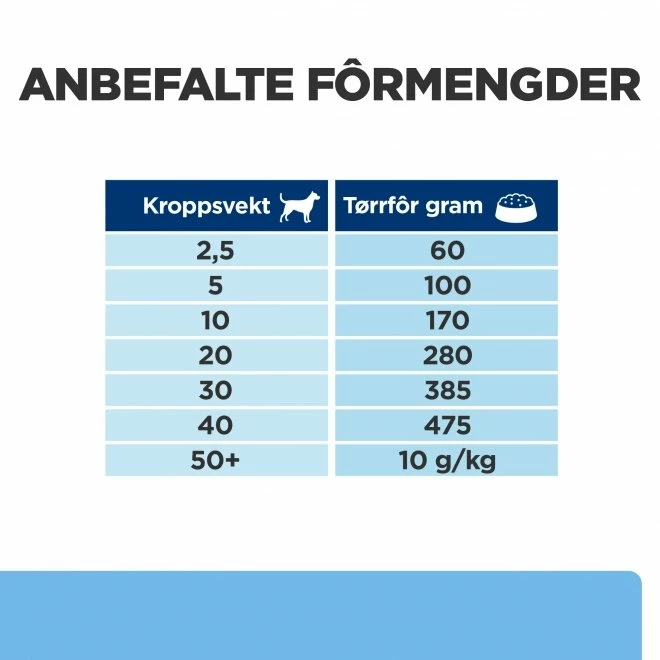 Se detaljert fôringsanvisning på forpakningen. Fôringsanvisning til høyre brukes for å beregne forbruk ved abonnering på fôr