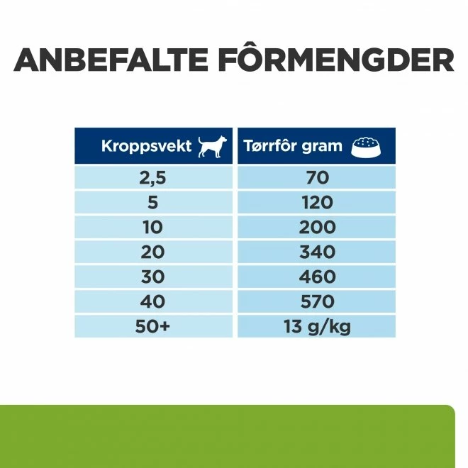 Se detaljert rasjonering på pakken. Rasjoneringen til høyre brukes til å beregne forbruk ved abonnering på fôr