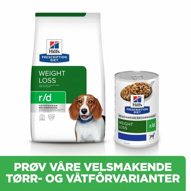 Det er vitenskapelig bevist at Prescription Diet Canine R/D veterinærfôr minsker mengden kroppsvekt med minst 22 % på 8 uker. Fôret har høyt kostfiberinnhold, som metter og motvirker tigging. Videre er fôret også beriket med L-karnitin og lysin, som stimulerer fettforbrenning og bevarer muskelmasse.