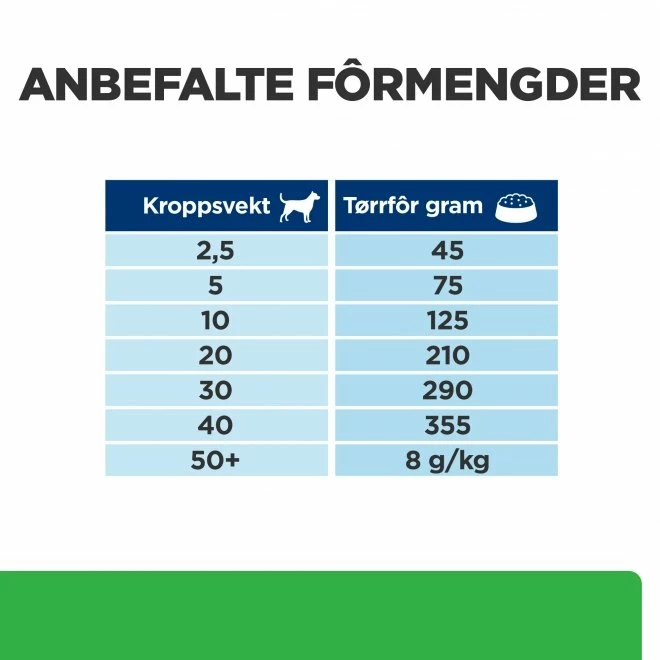 Se detaljert rasjonering på pakken. Rasjoneringen til høyre brukes til å beregne forbruk ved abonnering på fôr