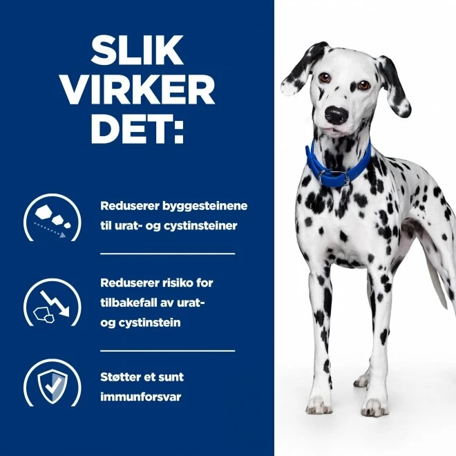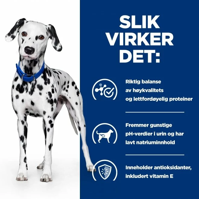 Hill’s Prescription Diet Canine u/d bidrar til å minske dannelsen av oksalat, urat- og cystin-urinsten. Veterinærfôret inneholder reduserte nivåer av proteiner av høy kvalitet, for å forhindre at slaggprodukter medfører ubehag hos hunder med nyresvikt og et minsket saltinnhold som kontrollerer væskeretensjonen ved tidlig hjertesykdom.