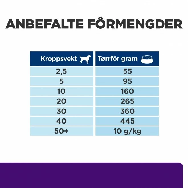Se detaljert rasjonering på pakken. Rasjoneringen til høyre brukes til å beregne forbruk ved abonnering på fôr