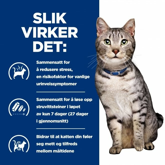 Dette veterinærfôret har et lavt fett- og kaloriinnhold som bidrar til å opprettholde idealvekten. Videre inneholder Hill´s Prescription Diet Metabolic en høy andel kostfiber som metter og motvirker tigging. Fôret er også beriket med et høyt nivå av L-karnitin som bidrar til fettforbrenning og bevarer musklene ved vektnedgang.