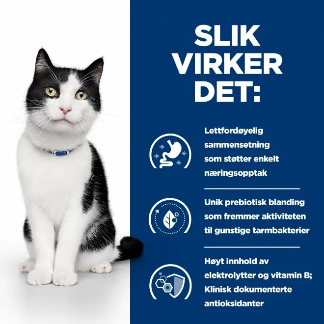 Hill’s Prescription Diet Feline i/d Digestive Care bidrar til god funksjon i mage- og tarmkanalen og er utviklet for å lindre mage- og tarmlidelser. Katter som har mageproblemer har ofte problemer med å ta opp næringsstoffer fra maten. For å hjelpe med dette er dette fôret ekstra lettfordøyelig, og inneholder mye B-vitaminer og elektrolytter.