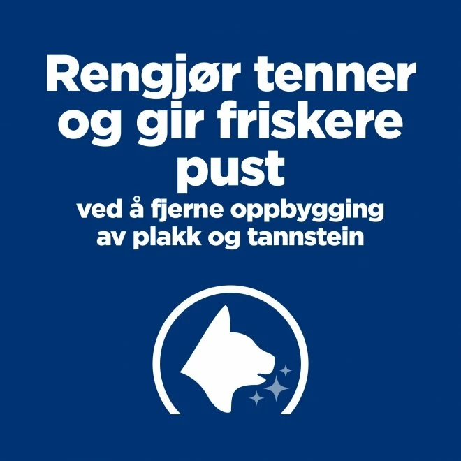 Det er klinisk bevist at Hill’s Prescription Diet Feline t/d reduserer oppbygging av tannsten, plakk og misfarging. Fôrbitene inneholder fibrer som ligger i et spesielt mønster og renser tennene når bitene tygges. Fôret bidrar også til å holde urinveiene friske. Fôrkulene er så store at hunden tvinges til å tygge dem.