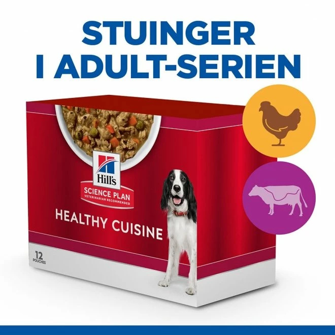Gi Hill’s Science Plan Canine Adult Healthy Cuisine Chicken & Beef som det er, eller bland det med hundens tørrfôr for å tilføre ekstra smak. Et svært velbalansert hundefôr med flere helsefordeler, som dessuten vil gi vann i munnen på pelsklumpen der hjemme! Nam!