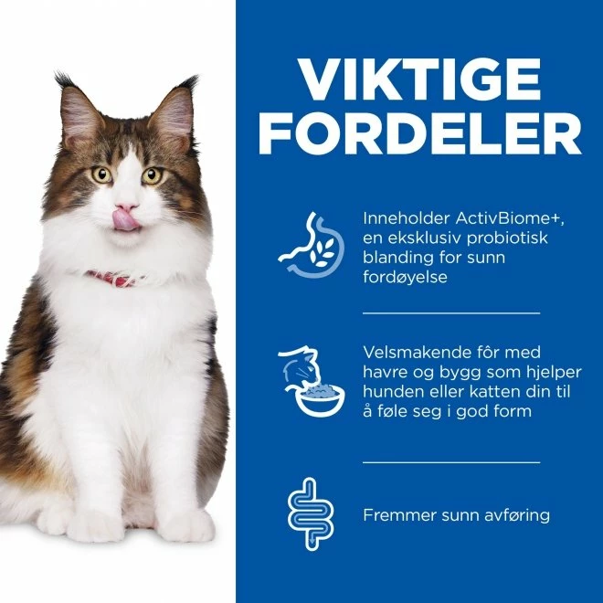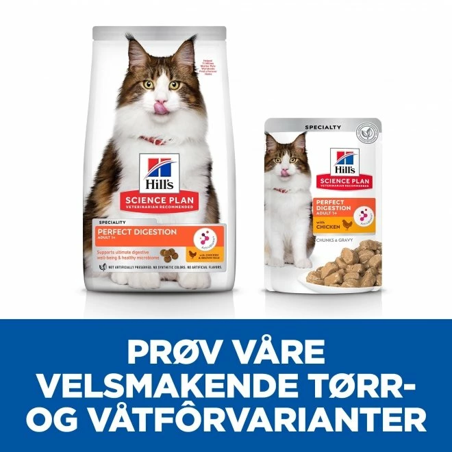 Hill’s Science Plan Cat Adult 1+ Perfect Digestion Chicken & Brown Rice er en komplett fullfôr beriket med Hills egne ActivBiome +, en unik blanding av prebiotika. Dette sikrer at katten får næring raskt, samtidig som den støtter tarmfloraen og bidrar til en god fordøyelse.