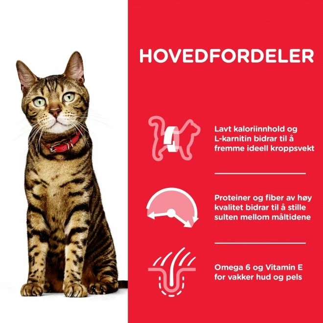 Dette fôret for voksne katter inneholder 24 % færre kalorier og 60 % mindre fett, for bedre vektregulering. Fôret har høyt fiberinnhold og gir økt metthetsfølelse mellom måltidene. Det er egnet for daglig fôring.