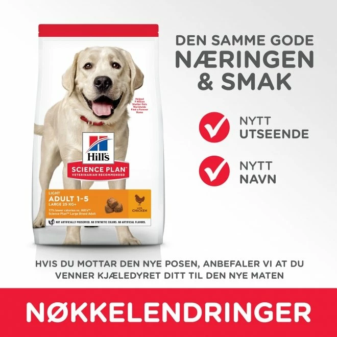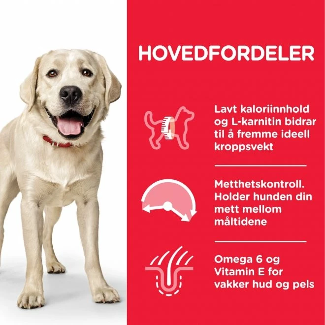 Hill’s Science Plan Canine Adult Large Breed Light hjelper med å unngå vektøkning. Fôret inneholder L-karnitin, som øker omdannelsen av fett til energi, for å motvirke fettlagring og fibrer som bidrar til å unngå sult. Fôret er til og med beriket med klinisk beviste antioksidanter som bidrar til å nøytralisere frie radikaler og beholde et friskt immunsystem.