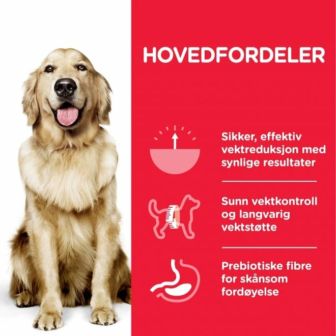 fôret hjelper hunder med å unngå vektøkning og bidrar til å forbrenne fett og opprettholde optimal vekt og smidig muskelmasse. Inneholder antioksidanter som fremmer naturlig beskyttelse. fôret har en nøye sammensatt balanse av energi, protein og vitaminer, men inneholder færre kalorier. Dette hjelper hunden med å opprettholde en sunn vekt. Fôret er spesielt tilpasset etter behovene til store hunderaser.