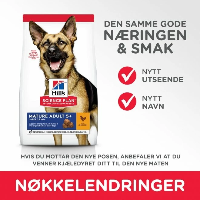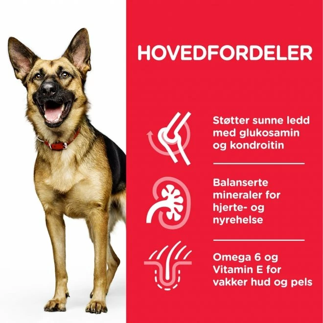 Hill’s Science Plan Canine Mature Adult 5+ Active Longevity Large Breed inneholder glukosaminhydroklorid og kondroitinsulfat, som hjelper med å holde leddene friske og gir bedre leddbevegelighet, og taurin, som hjelper med å holde hjertet friskt. Fôret er også beriket med superantioksidanter som nøytraliserer frie radikaler og bidrar til å holde immunforsvaret friskt.