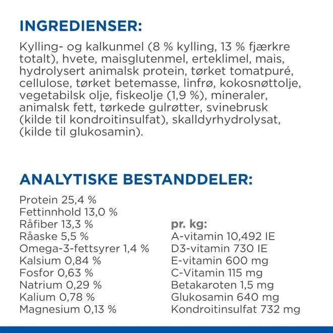 Noe som dessverre er ganske vanlig hos overvektige hunder er problemer med ledd og mobilitet. Derfor har man valgt å tilsette både omega-3, kondroitin og glukosamin i dette tørrfôret.
