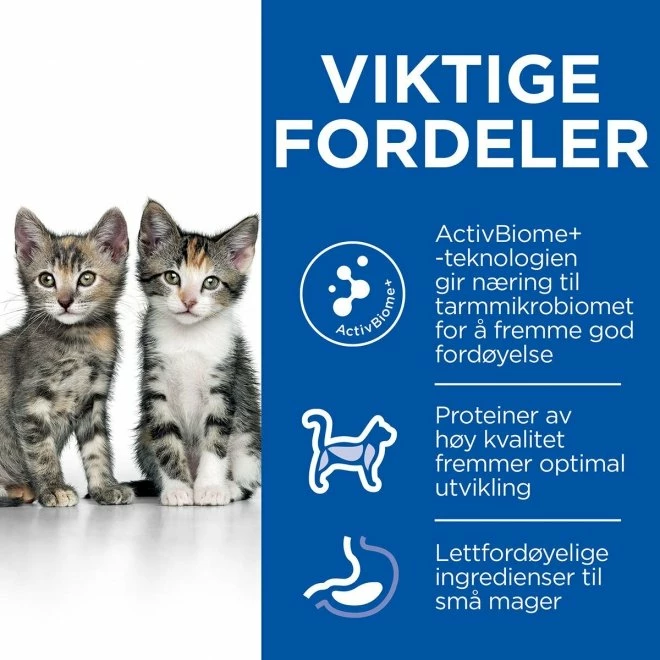 Tørrfôr for kattunger med ekstra behov for støtte til mage og tarm. Hill’s Science Plan Kitten Perfect Digestion Chicken er et unikt tørrfôr på markedet med Hill’s ActiveBlome-teknologi som styrker miljøet i kattens fordøyelsessystem! Dette er en revolusjonerende, prebiotisk kombinasjon som gir næring til kattens mage- og tarmbakterier, og som øker fordøyelsesevnen. Dette bidrar også til fin avføring!