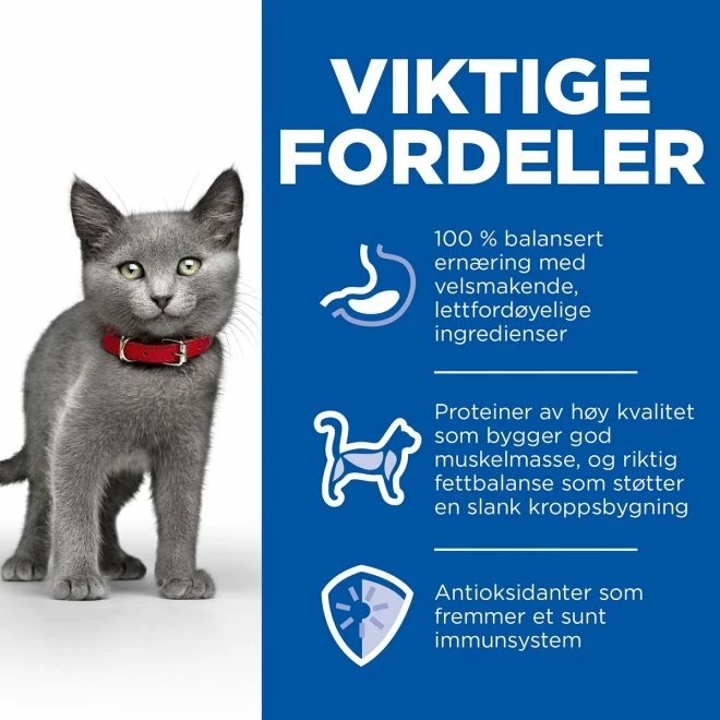 Tørrfôr for kastrerte kattunger. Med kontrollert fettinnhold og proteiner av høy kvalitet! Hill’s Science Plan Kitten Sterilised Chicken er et velkomponert kattefôr med særlig omtanke for unge katter! Fôret inneholder kvalitetsråvarer og er godt balansert. På den måten får din kastrerte kattunge i seg riktig mengde kvalitetsnæring for å vokse seg sunn og sterk, uten å risikere å gå opp i vekt!