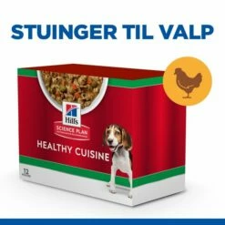 Hill’s Science Plan Puppy Medium & Large Healthy Cuisine Chicken Stew er et valpefôr og våtfôr for mellomstore og store hundevalper. Fôret kommer med kjøttfylte kyllingbiter i lekker saus og fiberrike grønnsaker, alt basert på en ekstra velsmakende og god oppskrift. Fôret bygger på råvarer av svært høy kvalitet for at din valp skal få de aller beste forutsetningene for å vokse seg sterk og sunn i sine første leveår!