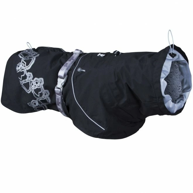Hurtta Drizzle Regnjakke er laget av et vanntett materiale, 10 000 mm vannsøyle, og den er foret med et folielignende materiale som reflekterer hundens kroppsvarme for å holde hunden varm under kjølige turer. Denne egenskapen er også utmerket før og etter trening og konkurranse når det er viktig at hundens blodsirkulasjon stimuleres.