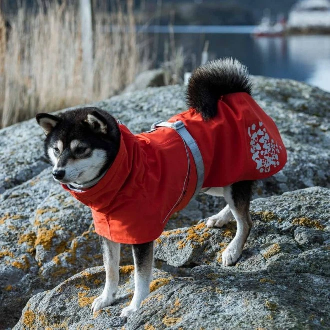 Denne komfortable jakken er utmerket for vårt nordiske klima. Den tåler kulde, vind og regn, og den har reflekser som gjør hunden mer synlig i mørket. De teipede sømmene sørger for at regnet ikke trenger inn.