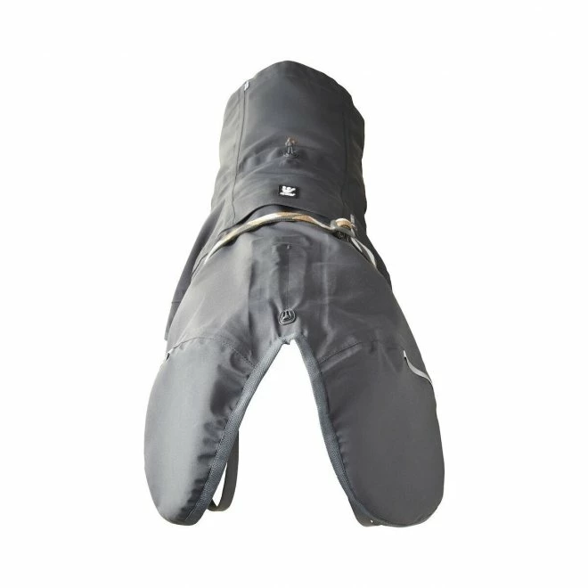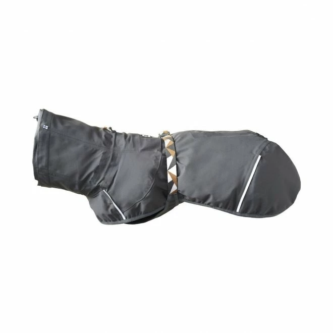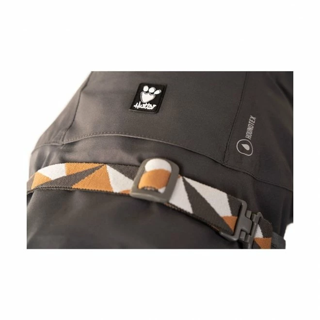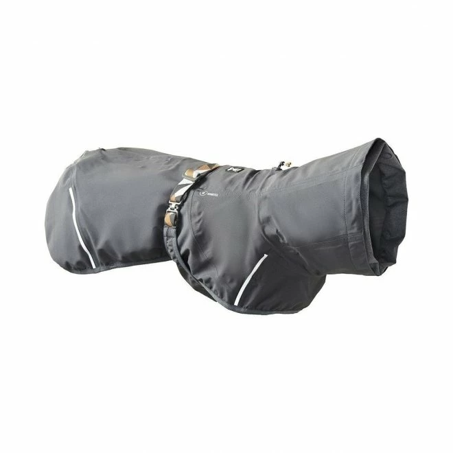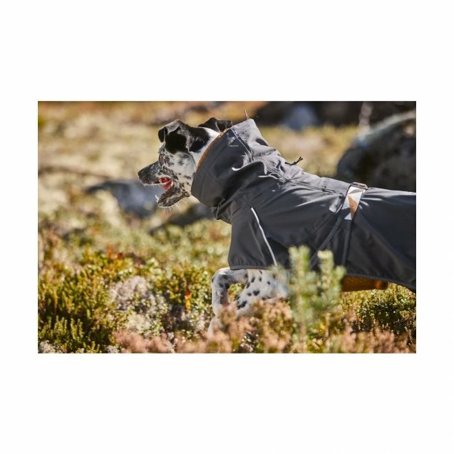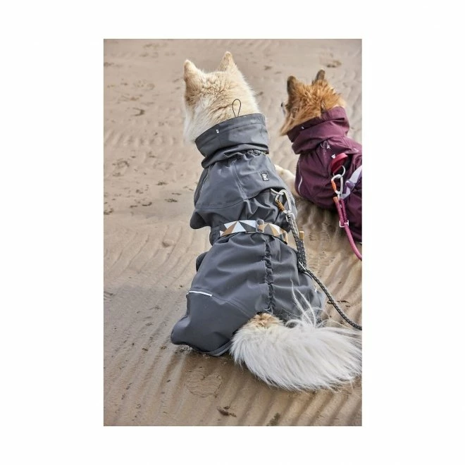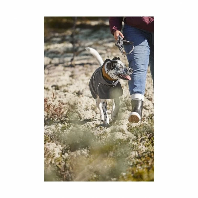 Hurtta Mudventure ECO Regnjakke Svart har smarte funksjoner som en praktisk åpning for kobbelet på ryggen, bakbeinstropp for å holde jakken på plass og refleksdetaljer som øker synligheten på mørke kveldturer.