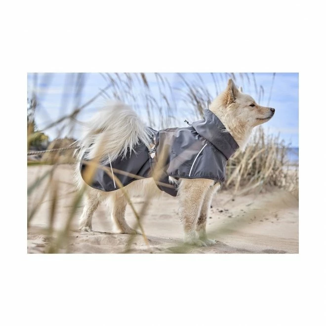 Regnjakken er laget av gjenvunnet materiale og er fri for fluorkarboner slik at regnjakken tar hensyn til både hundens velvære og miljøet.