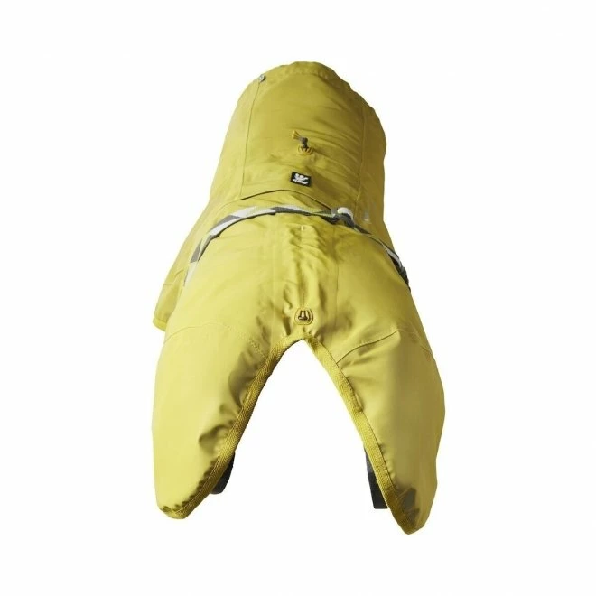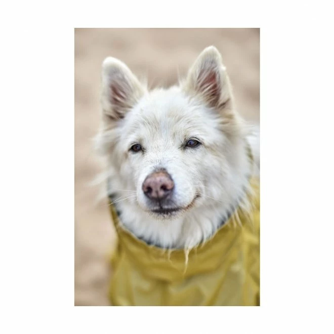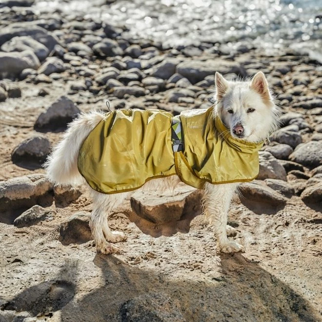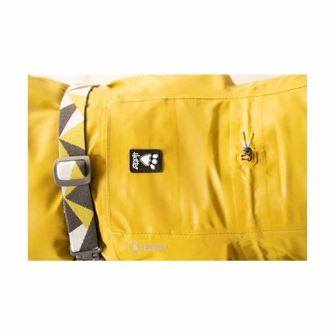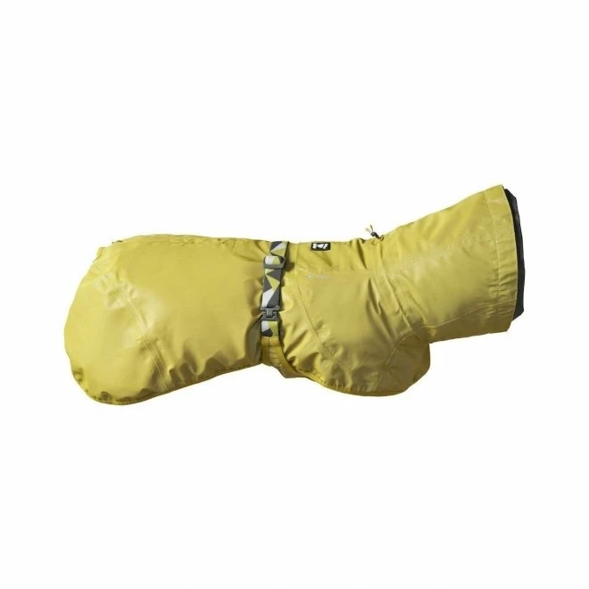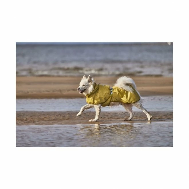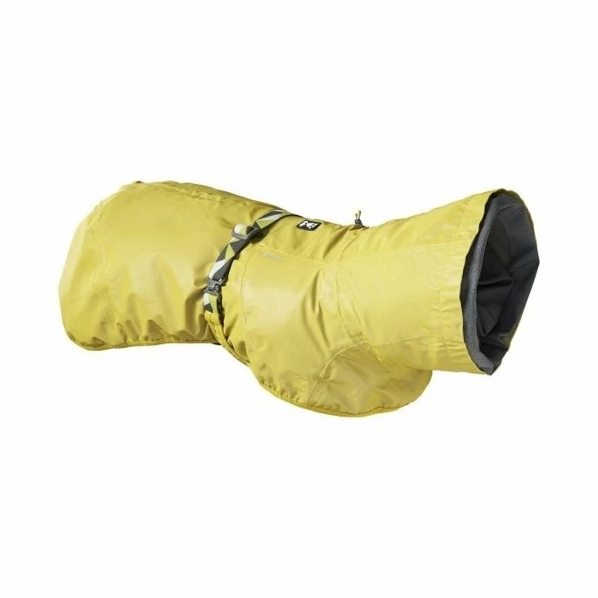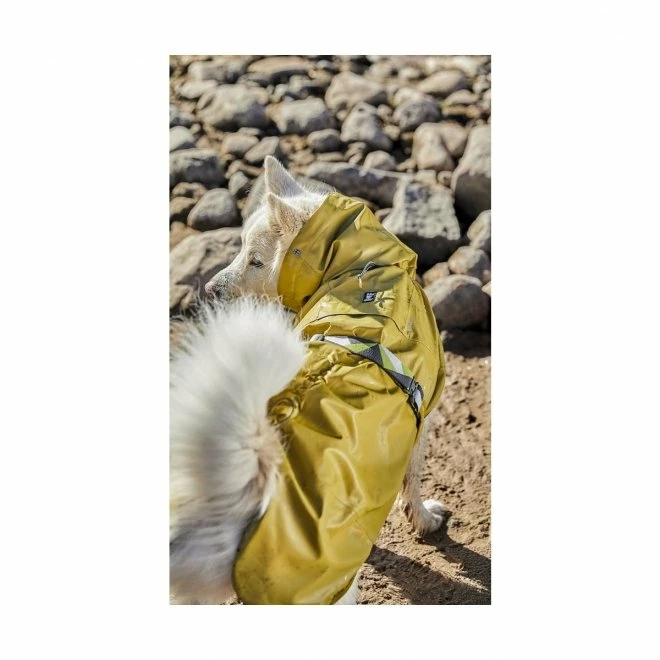 Hurtta Mudventure Regnjakke Reflekterende Gul er laget av gjenvunnet materiale og er fri for fluorkarboner, denne regnjakken er et godt valg for både hunden og miljøet.