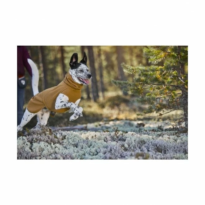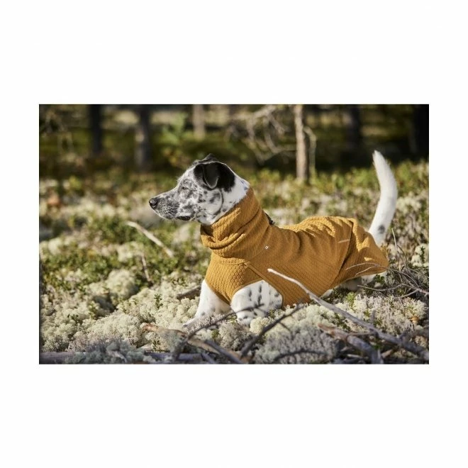 Hurtta Warming Midlayer ECO Hundegenser Sennepsgul er ergonomisk designet for økt bevegelsesfrihet. Den har ingen glidelåser eller spenner, noe som gjør den enkel å ta av og på.