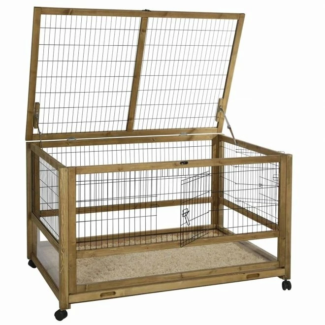 Buret kan åpnes både på toppen og fra kort- og langsidene, noe som gir enklere rengjøring og gjør det enklere for dyrene å gå inn og ut. For å gjøre det enklere for dyrene når de skal gå inn og ut av buret kan du også komplettere med et liten rampe som plasseres mot åpningen.