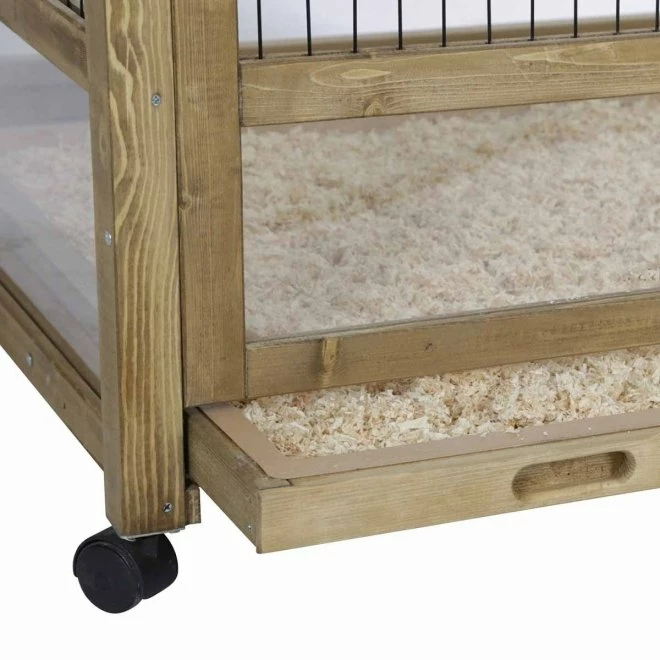 Kerbl Smådyrsbur Innendørs er laget av tre med metallgitter. Helt nederst er det pleksiglass som sørger for at materialet i bunnen holder seg på plass, samtidig som at dyret kan se ut, i tillegg til at det blir lyst inne i buret. Det er vanligst med farget plast nederst – dette sørger for at miljøet i buret blir mørkere.