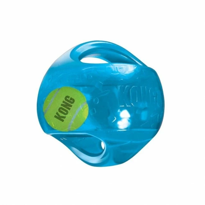 Den gjennomsiktige ytterdelen finnes i rødt og blått, og viser det spennende innholdet på innsiden: en høylydt squeaker med pipelyd som setter i gang leken samt en tennisball med KONG-logo som ruller rundt inne i leken, og holder farten oppe.