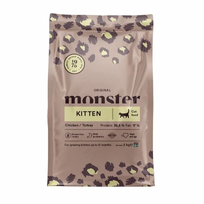 Kattens første leveår er kanskje det aller viktigste. Da utvikler den seg fra kattunge til voksenkatt på kort tid, og skal i denne perioden vokse til den størrelsen den skal ha resten av livet! Dette krever mye energi, og fôret bør være gjennomtenkt og holde beste standard. Monster Kitten Chicken & Turkey inneholder alt dette for å gi din kattunge de beste forutsetninger og solide byggestener i møte med livets utfordringer!