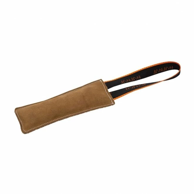 NufNufs kamprulle i skinn er laget av jute og semsket skinn som er slitesterkt, men samtidig trygt for hundens munn og mage (om hunden skulle bite av en bit). Kamprullen, eller Dummien, er fylt med kokosfiber, også det et naturlig materiale. Kamprullens håndtak er av slitesterk polyestervev med refleksdetaljer slik at den vises i mørket hvis dere leker ute etter at det er blitt mørkt. Størrelse 18 cm, ekskludert håndtak.