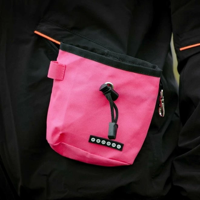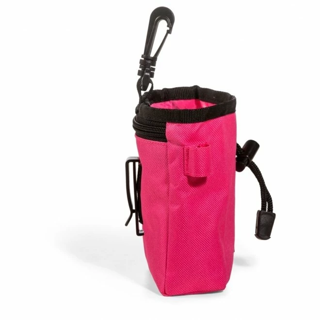 Treningsposen er lett å holde ren med en fuktig klut. Den kommer i to lekre farger. Den ene i ekte sjokkrosa med svarte detaljer, den andre helsvart med turkist innslag. Hunden vil fort lære seg å kjenne igjen posen og forbinde den med morsomt samvær med deg. Så, hva venter dere på? Fyll opp med favorittgodbiten og sett i gang!