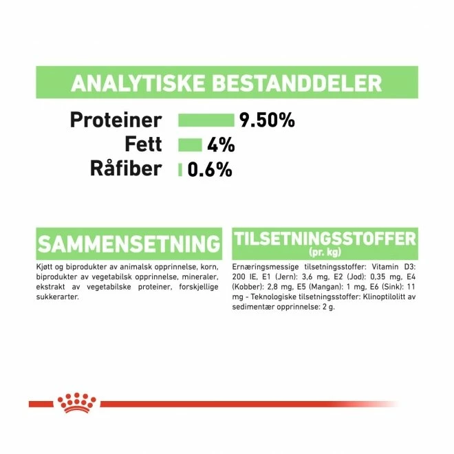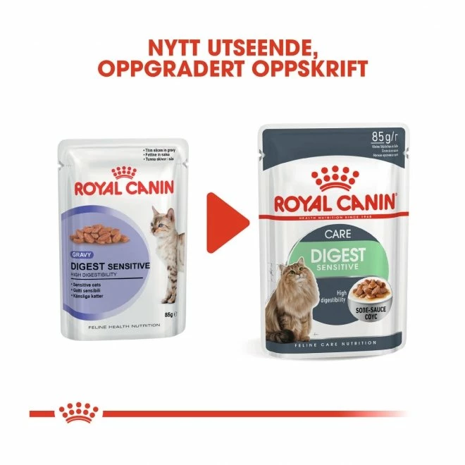 Royal Canin Wet Digest Sensitive er et våtfôr som egner seg om katten har sensitiv fordøyelse. Hvis fordøyelsen er dårlig kan balansen forstyrres, noe som kan få uønskede effekter: oppblåsthet og myk, illeluktende avføring. Fôret må gi ekstra lett fordøyelige proteiner samtidig som det bidrar til å opprettholde kattens idealvekt. Fremmer et friskt urinsystem ved å redusere konsentrasjonen av mineraler, noe som kan føre til at det dannes urinstein.