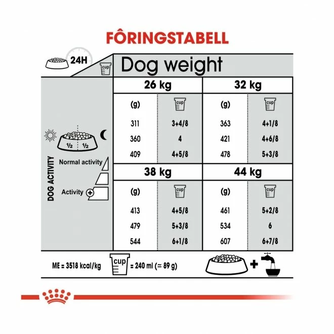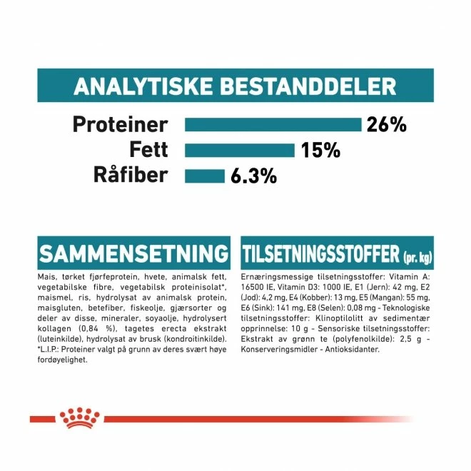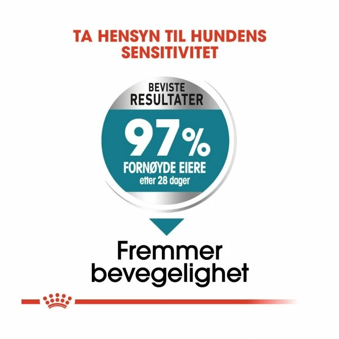 Dette fôret er tilpasset til store hunders aktivitet, da deres størrelse i seg selv belaster leddene og kan føre til at leddene blir stive og følsomme. Med tiden kan det føre til begrenset bevegelighet og lavere aktivitet. En unik og innovativ kombinasjon av næringsstoffer i fôret forbedrer bevegeligheten og støtter leddenes funksjon. Du ser resultat allerede etter en måned!