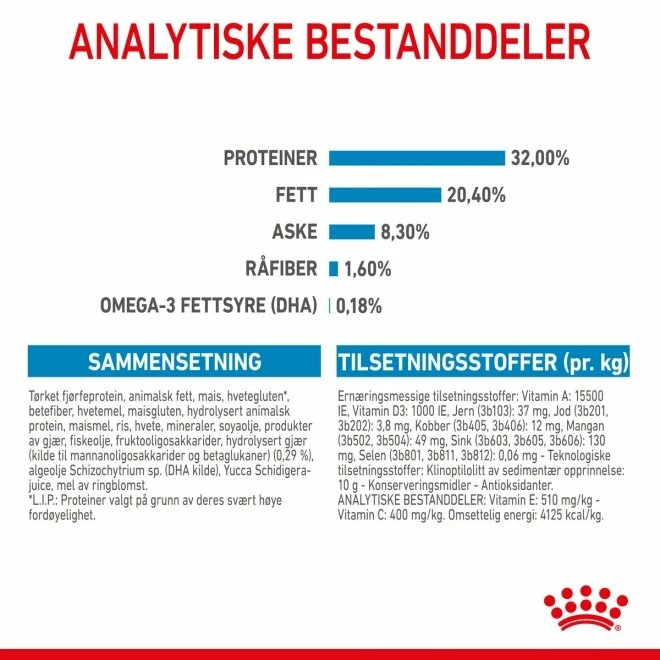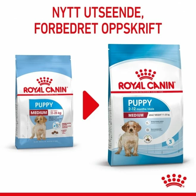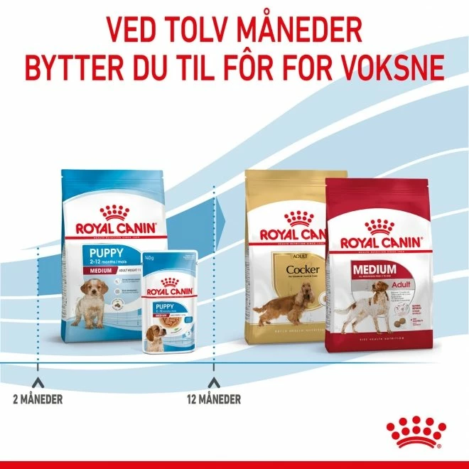 - Fôr for 2–12 måneder gamle valper med en voksenvekt på mellom 11 og 25 kg
